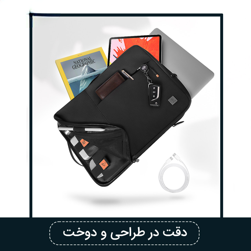 • دارای جیب که شامل محفظه نگهداری خودکار، پاور بانک، شارژر، ماوس و غیره می باشد تمام قسمت های دارای زیپ توسط پلاستیکی پوشانده شده اند که مانع از ورود گردوغبار و آب می باشد دارای یک جیب در قسمت جلویی کیف که دارای محفظه نگهداری خودکار، کارت و گوشی موبایل و غیره می باشد جنس پارچه داخل کیف: آستر بسیار نرم فلانل که در برابر هرگونه ضربه ، خراش و گرد و غبار محافظت بهتری دارد.